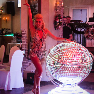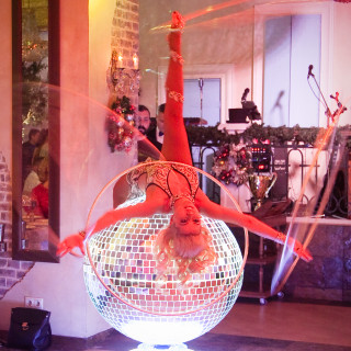 Эффектный номер для корпоративных праздников, презентаций, свадеб или юбилеев! Номер сочетает в себе элементы акробатики, эквилибра и пластики. Завораживающее вращение хула-хупов выполняется на зеркальном шаре. Основное требование к площадке - высота потолком не менее 3.5 метров.